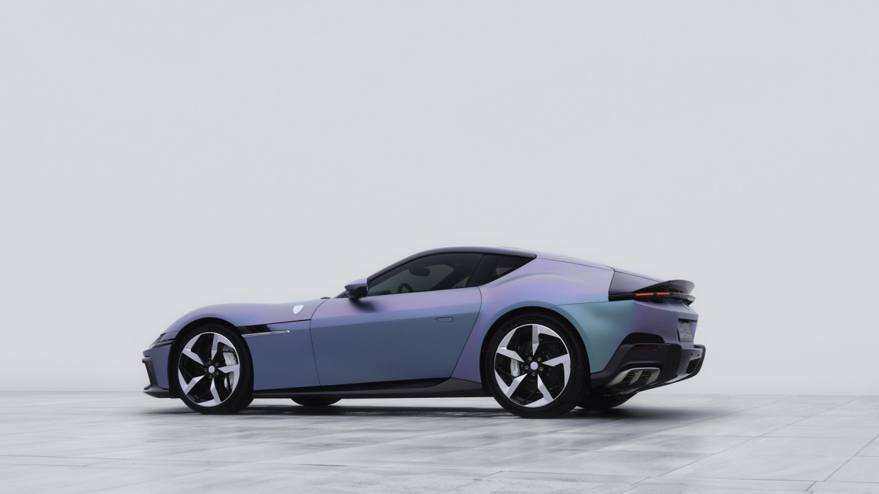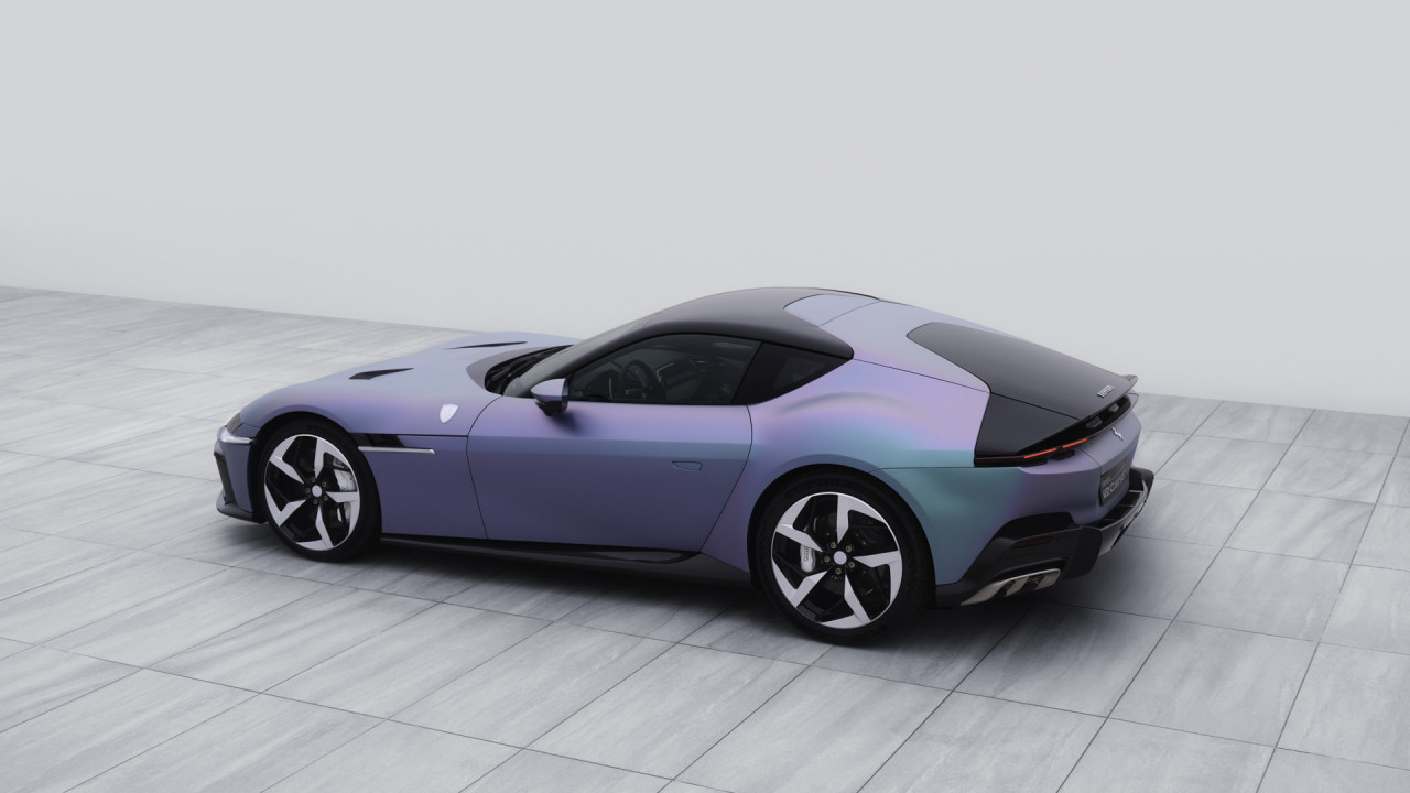 The exterior finish is a case in point. The paint, known as Yoonseul, draws inspiration from traditional Korean ceramics and the visual rhythm of modern Seoul. It is deliberately difficult to define. Depending on light and angle, it moves between green, blue and violet, lending the body a sense of motion even when stationary. Importantly, it does not fight the 12Cilindri’s design language. The proportions remain clean, the surfaces calm. The colour enhances the form rather than demanding attention from it — a decision that reflects maturity rather than bravado.